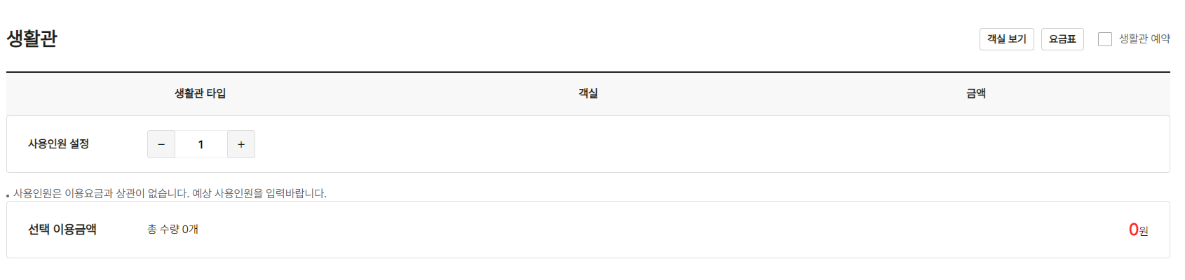 - 생활관 설정: 생활관 선택 항목에서 숙박할 방의 수와 타입을 결정합니다. 예약 페이지에서는 각 생활관의 세부 정보를 제공하여 선택을 돕습니다.