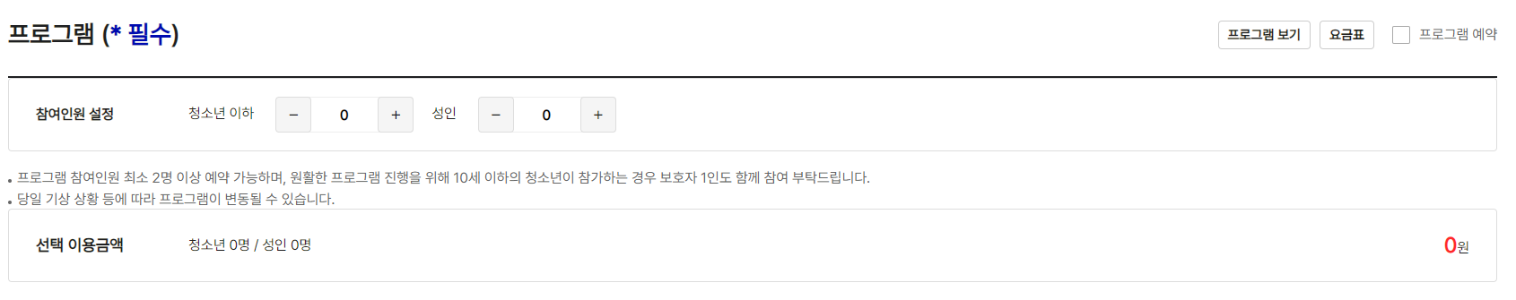 - 프로그램 선택: 생태탐방 프로그램을 선택할 수 있으며, 성인 및 청소년 인원수를 입력하여 프로그램 참여를 예약합니다.