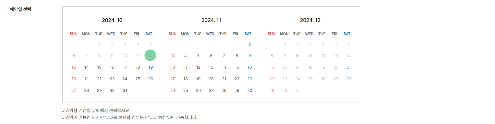 - 날짜 선택: 원하는 입실 날짜와 퇴실 날짜를 달력에서 선택합니다. 예약 가능 날짜는 달력에 표시되어 있으며, 현재 가능한 숙박 일정을 쉽게 확인할 수 있습니다.