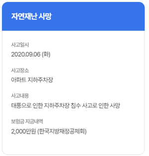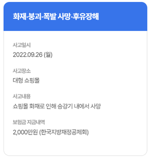 - 보장 범위: 자연재해, 화재, 폭발, 붕괴, 대중교통 사고 등 (자세한 내용은 각 지역별 상이)