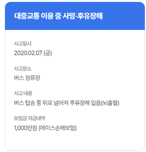 - 자연재해, 화재, 대중교통 사고 등으로 인한 사망, 후유장해, 치료비를 보장합니다.