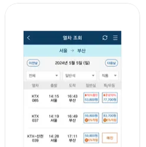 코레일톡 어플을 통해 실시간으로 열차 시간을 조회하고 예매할 수 있습니다. 출발지와 도착지를 입력하면 가능한 모든 열차의 시간표가 제공되며, 사용자는 원하는 시간대의 열차를 선택해 예약할 수 있습니다. 또한, 일반석, 특실 등의 좌석을 선택할 수 있어 더욱 편리합니다.