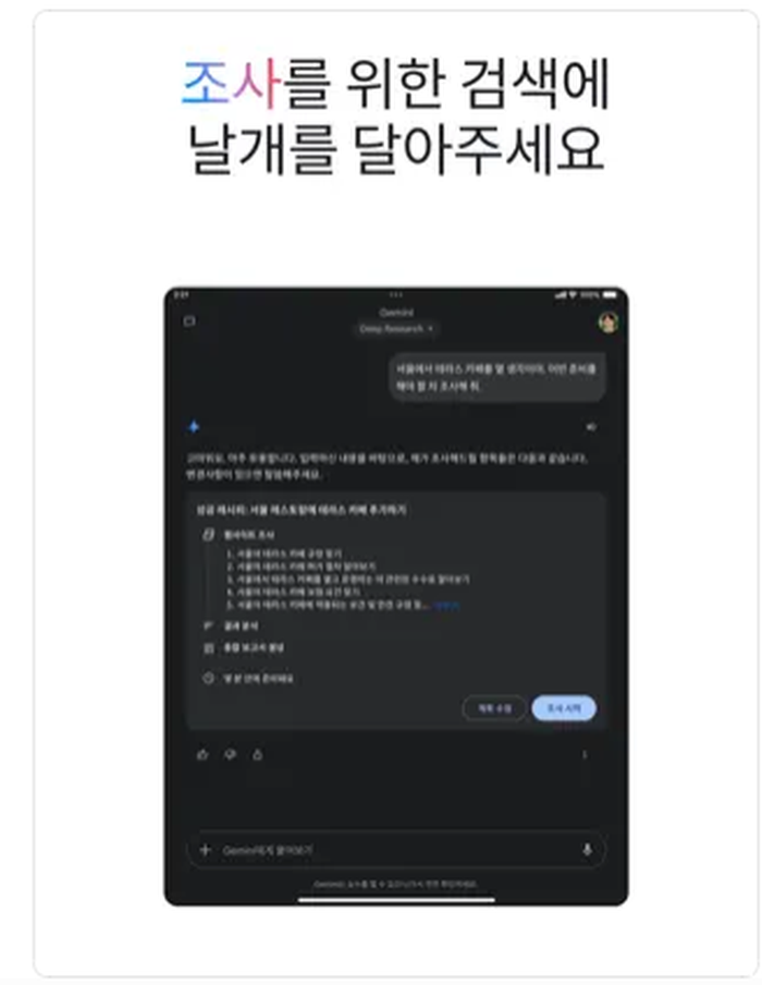 - 사진 또는 문서 업로드: Gemini는 이미지 해석도 가능하므로, 카메라로 사진을 찍어 바로 질문하는 것도 가능합니다.