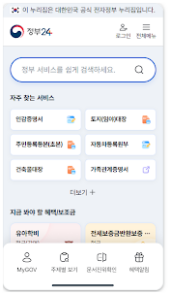 정부 지원금 조회 사이트 정부24는 정부의 민원 서비스, 정부혜택(보조금24), 정책정보/기관정보 등을 한 곳에서 한 눈에 찾을 수 있고 각 기관의 주요 서비스를 신청·조회·발급할 수 있는 대한민국 정부 대표 포털입니다