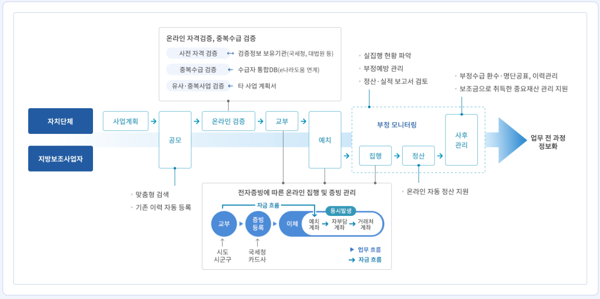 또한 보템e 시스템은 외부 정보 시스템과의 연계를 통해 검증 기능을 강화하였습니다. 가족관계 등록사항이나 사업자등록정보 등 관련 행정망과 연동되어 있어, 보조사업 자격 요건을 온라인으로 즉시 확인할 수 있습니다. 이는 자격이 없는 대상에게 보조금이 지급되는 것을 차단하는 역할을 합니다. 더불어 교부 총액이 500만 원 이상인 모든 지방보조사업자는 보템e 시스템을 통해 사업 관련 정보를 의무적으로 공시해야 하므로 주민에 의한 감시와 투명한 공개가 보장됩니다.