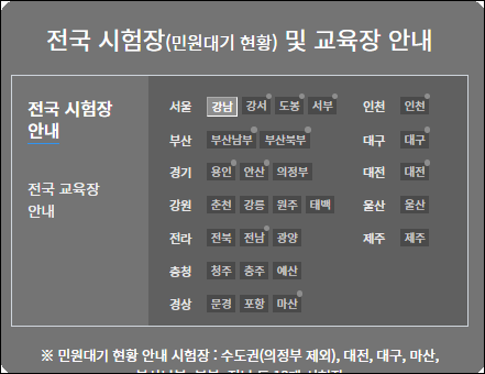 한국도로교통공단 안전운전 통합민원 전국 시험장(민원대기 현황) 및 교육장 안내 ※ 민원대기 현황 안내 시험장 : 수도권(의정부 제외), 대전, 대구, 마산, 부산남부·북부, 전남 등 13개 시험장